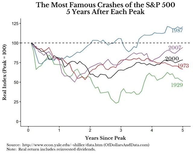 Na dalších grafech je zobrazen vývoj akciového trhu v letech po dosažení vrcholu a obratu trendu. První graf ukazuje vývoj v následujících pěti letech. Je jasné, že s výjimkou konce 80. let, kdy propad nebyl až tak výrazný, byli investoři i po pěti letech stále ve ztrátě (zejména ti, kteří investovali na vrcholu).