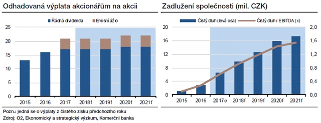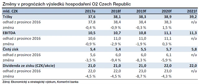 "V horizontu prognózy čekáme pozvolný růst čistého zisku O2 Czech Republic (v průměru o 1,5 % ročně). Díky odkupu vlastních akcií by měla dividenda růst o něco rychleji než čistý zisk (+2,9 %). V prognóze jsme navýšili úroveň celkového dluhu, který se promítl i do růstu čistého dluhu vůči EBITDA ke konci roku 2021 k 1,5násobku, což je na úrovni střednědobého cíle stanoveného managementem," uzavírá analytik z Komerční banky.