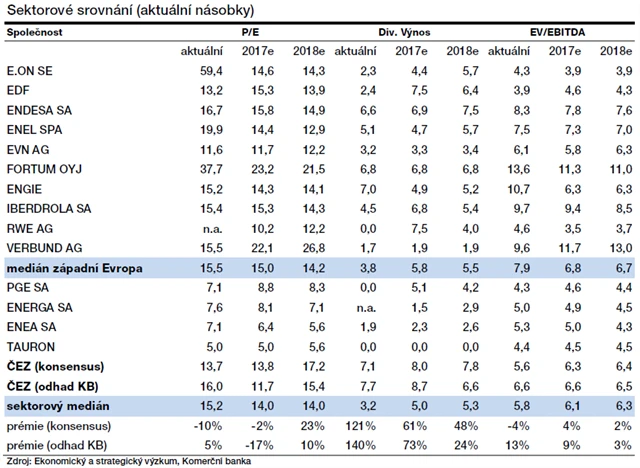 Analytik Richard Miřátský z Komerční banky vylepšil investiční doporučení na akcie energetické společnosti ČEZ na stupeň "koupit" s cílovou cenou 542 korun. Důvodem je zlepšující se využívání jaderných zdrojů, růst cen silové elektřiny podpořený vyššími cenami uhlí a odlepení ceny emisních povolenek od úrovně 5 EUR za tunu. V dlouhodobém horizontu Komerční banka vidí potenciál růstu cen díky snižování výrobních kapacit konvenčních zdrojů v Německu po roce 2020.