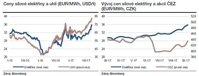 2. Především díky růstu cen uhlí vystoupala cena silové elektřiny od první poloviny loňského roku z 20 EUR/MWh k současným 35 EUR/MWh. Přestože se vývoj cen elektřiny promítá do hospodaření společnosti díky zajišťování prodejů s prodlevou 1-3 let, cena akcií ČEZ historicky úzce koreluje s cenou elektřiny. Rostoucí cena silové elektřiny, která od léta vzrostla o 15 % oproti 5% růstu ceny akcií ČEZ, podle KB začíná vytvářet potenciál růstu ceny akcií společnosti i v krátkodobém horizontu.