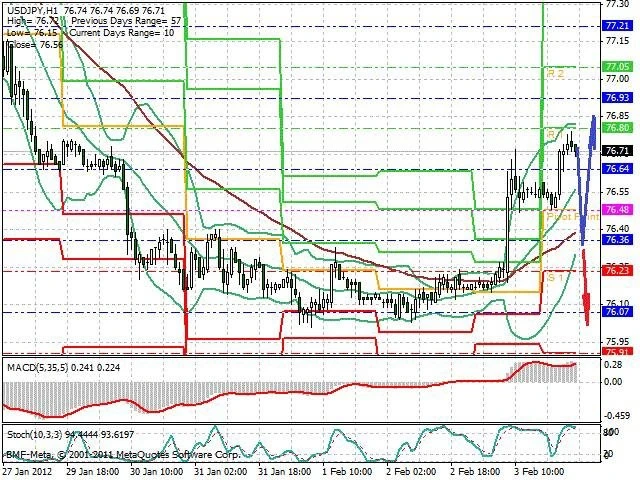Předpokládaný pohyb pro dnešní den LONG. Případné vstupy do obchodu z hladiny 76.35 s předpokládaným cílem 76.85, případně až 77.05. Proražení hladiny 76.35 může vést k pohybu s pravděpodobným cílem 76 až 75.75.