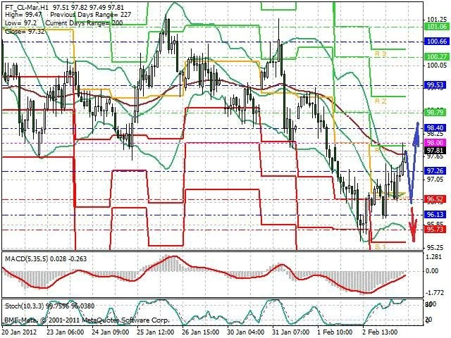 Předpokládaný pohyb pro dnešní den LONG. Případné vstupy do obchodu z hladiny 96.45 s předpokládaným cílem 98.5 případně až 99.45. Proražení hladiny 96.45 může vést k pohybu s pravděpodobným cílem 95.45 až 93.9.