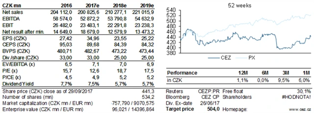 Akcie ČEZ se podle Bártka obchodují na poměrně vysokých odhadovaných násobcích zisků pro roky 2018 a 2019 z důvodu dlouhodobého zajišťování cen elektřiny ze strany firmy. Nicméně ocenění při zohlednění aktuálních cen elektřiny na burze (okolo 35 EUR/MWh) je přiměřené (EV/EBITDA pro rok 2018 na úrovni 6 a P/E pro rok 2018 okolo 13). "Pro rok 2017 odhadujeme dividendový výnos asi 7,5 % a pro roky 2018 a 2019 předpokládáme přibližně 5,7 %. Dlouhodobě počítáme s výnosem na úrovni 7,5 %," napsal Bártek.
