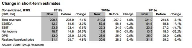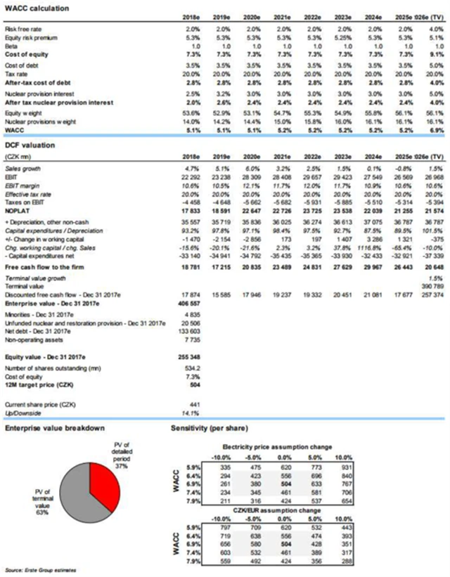 Hlavní změny v modelu jsou spojeny s předpovědí na rok 2018. "Odhadujeme, že v blízké době dojde ke snížení volného peněžního toku (v důsledku slabšího fiskálního roku 2017). Pracujeme také s nižšími váženými náklady kapitálu (WACC -20 bazických bodů) díky nižšímu podílu vlastního kapitálu," doplnil Bártek. "Období let 2018-2019 vnímáme jako náročnější, následně očekáváme skok ve volném peněžním toku a přiblížení cen silové elektřiny prodávané ČEZ k tržním úrovním."