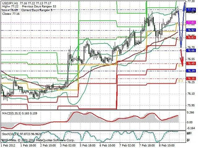 Předpokládaný pohyb pro dnešní den LONG. Případné vstupy do obchodu z hladiny 76.7 s předpokládaným cílem 77.25, případně až 77.45. Proražení hladiny 76.7 může vést k pohybu s pravděpodobným cílem 76.45 až 76.25.