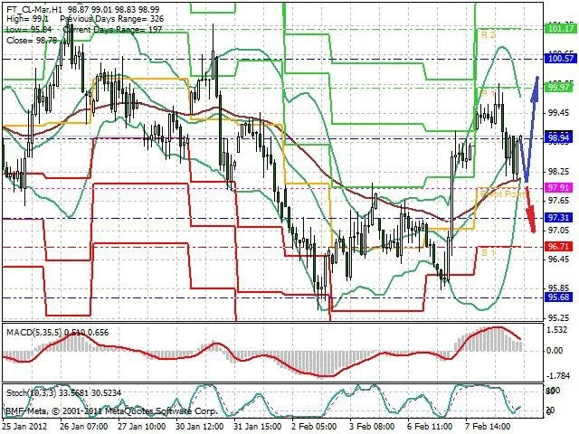 Předpokládaný pohyb pro dnešní den LONG. Případné vstupy do obchodu z hladiny 98 s předpokládaným cílem 100.1 případně až 100.5. Proražení hladiny 98 může vést k pohybu s pravděpodobným cílem 97.5 až 97.1.
