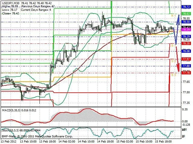 Předpokládaný pohyb pro dnešní den LONG. Případné vstupy do obchodu z hladiny 78.2 s předpokládaným cílem 78.6, případně až 78.75. Proražení hladiny 78.2 může vést k pohybu s pravděpodobným cílem 77.8 až 77.5.
