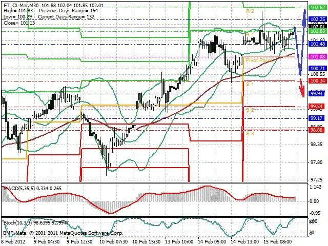 Předpokládaný pohyb pro dnešní den LONG. Případné vstupy do obchodu z hladiny 100.55 s předpokládaným cílem 102.6 případně až 102.9. Proražení hladiny 100.55 může vést k pohybu s pravděpodobným cílem 99.9 až 99.3.