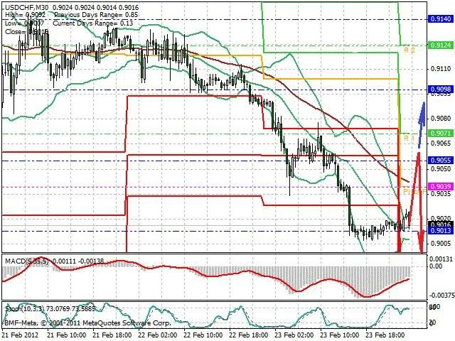 Předpokládaný pohyb pro dnešní den SHORT. Případné vstupy do obchodu z hladiny 0.906 s předpokládaným cílem 0.9, případně až 0.897. Proražení hladiny 0.906 může vést k pohybu s pravděpodobným cílem 0.909 až 0.9135.