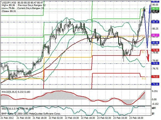 Předpokládaný pohyb pro dnešní den LONG. Případné vstupy do obchodu z hladiny 80 s předpokládaným cílem 80.55, případně až 81. Proražení hladiny 80 může vést k pohybu s pravděpodobným cílem 79.85 až 79.55.