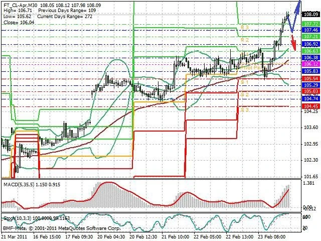 Předpokládaný pohyb pro dnešní den LONG. Případné vstupy do obchodu z hladiny 107.4 s předpokládaným cílem 109.3 případně až 110.35. Proražení hladiny 107.4 může vést k pohybu s pravděpodobným cílem 106.75 až 105.55.