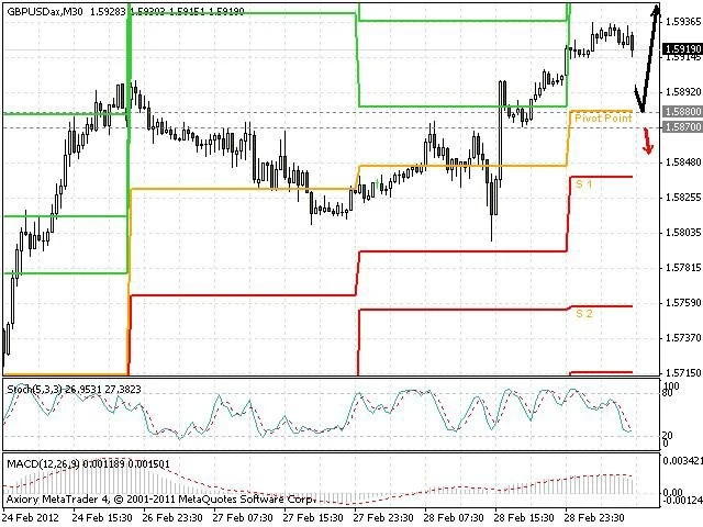 Předpokládaný pohyb pro dnešní den LONG. Případné vstupy do obchodu z hladiny 1.588 s předpokládaným cílem 1.595, případně až 1.5985. Proražení hladiny 1.587 může vést k pohybu s pravděpodobným cílem 1.5805 až 1.5755.