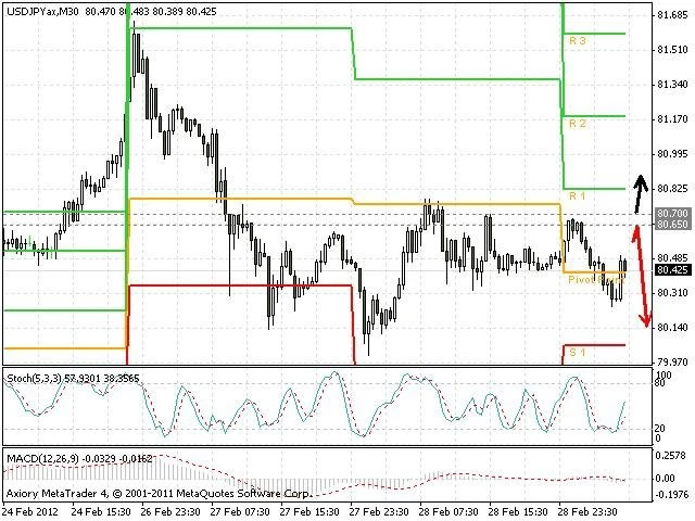 Předpokládaný pohyb pro dnešní den SHORT. Případné vstupy do obchodu z hladiny 80.65 s předpokládaným cílem 80, případně až 79.8. Proražení hladiny 80.7 může vést k pohybu s pravděpodobným cílem 80.95 až 81.2.