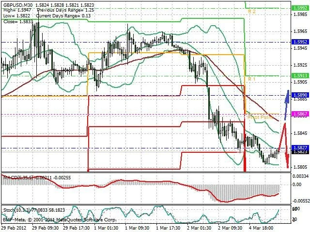 Předpokládaný pohyb pro dnešní den SHORT. Případné vstupy do obchodu z hladiny 1.5855 s předpokládaným cílem 1.5805, případně až 1.5785. Proražení hladiny 1.5865 může vést k pohybu s pravděpodobným cílem 1.5895 až 1.5935.