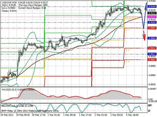 Předpokládaný pohyb pro dnešní den LONG. Případné vstupy do obchodu z hladiny 0.9085 s předpokládaným cílem 0.9155, případně až 0.9175. Proražení hladiny 0.9085 může vést k pohybu s pravděpodobným cílem 0.906 až 0.9025.