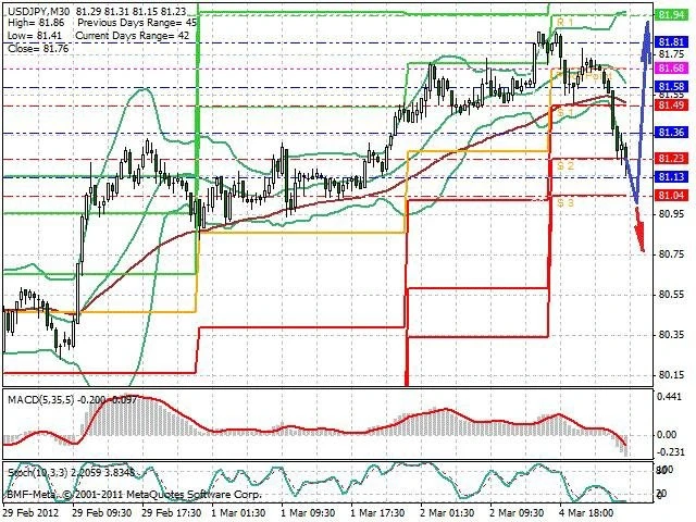 Předpokládaný pohyb pro dnešní den LONG. Případné vstupy do obchodu z hladiny 81.1 s předpokládaným cílem 81.9, případně až 82.4. Proražení hladiny 81.1 může vést k pohybu s pravděpodobným cílem 80.8 až 80.2.
