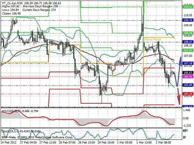Předpokládaný pohyb pro dnešní den LONG. Případné vstupy do obchodu z hladiny 105.8 s předpokládaným cílem 107.6 případně až 108.15. Proražení hladiny 105.8 může vést k pohybu s pravděpodobným cílem 104.85 až 104.