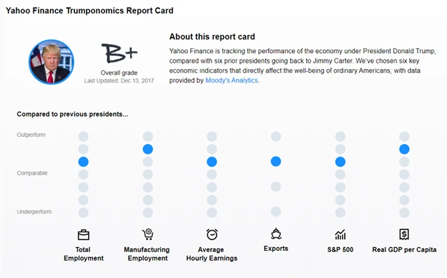 Trumponomika si (zatím) v hodnocení Yahoo! Finance zasluhuje lepší dvojku. Srovnání se šesticí předchozích prezidentů, ze kterého index Yahoo! vychází, přitom pro stávajícího rtuťovitého nájemníka Bílého domu vyznívá nadprůměrně ve všech šesti sledovaných ukazatelích. HDP na hlavu a zaměstnanost ve výrobním sektoru si dokonce bezmála vysloužily absolutorium, za což se také prezident v jednom ze svých sebeoslavných tweetů neopomněl pochválit. Stejně tak jako za rekordní ceny akcií.