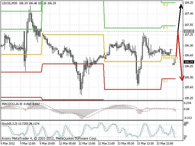 Předpokládaný pohyb pro dnešní den SHORT. Případné vstupy do obchodu z hladiny 107.35 s předpokládaným cílem 105.85, případně až 105.4. Proražení hladiny 107.35 může vést k pohybu s pravděpodobným cílem 108.15 až 109.2.