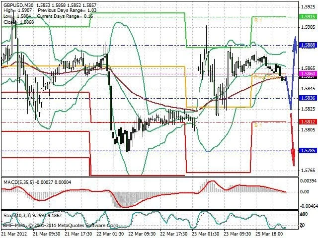 Předpokládaný pohyb pro dnešní den LONG. Případné vstupy do obchodu z hladiny 1.5825 s předpokládaným cílem 1.5895, případně až 1.592. Proražení hladiny 1.5815 může vést k pohybu s pravděpodobným cílem 1.577 až 1.574.