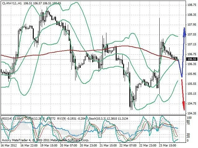 Předpokládaný pohyb pro dnešní den LONG. Případné vstupy do obchodu z hladiny 105.7 s předpokládaným cílem 107.85 případně až 108.65. Proražení hladiny 105.7 může vést k pohybu s pravděpodobným cílem 104.5 až 103.5.