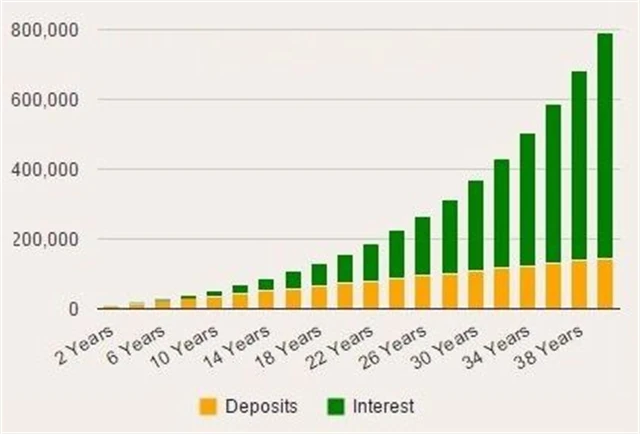 Dobře rozdíl mezi spořením a investováním ilustruje graf, v němž žluté části sloupců představují naspořené částky, zatímco zeleně jsou znázorněny výnosy. Je patrné, že v prvních letech má spoření navrch, čím delší je ale horizont, tím výhodnější je investování.