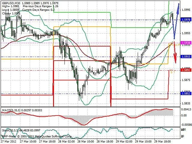 Předpokládaný pohyb pro dnešní den LONG. Případné vstupy do obchodu z hladiny 1.5945 s předpokládaným cílem 1.6, případně až 1.6025. Proražení hladiny 1.5935 může vést k pohybu s pravděpodobným cílem 1.59 až 1.586.