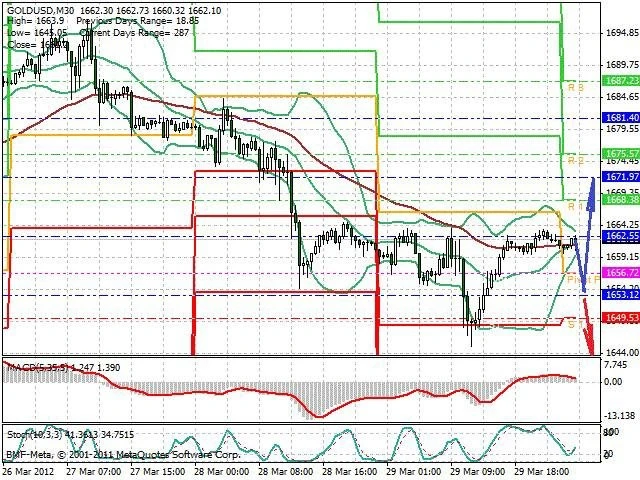 Předpokládaný pohyb pro dnešní den LONG. Případné vstupy do obchodu z hladiny 1 654 s předpokládaným cílem 1 671, případně až 1 676.5. Proražení hladiny 1 654 může vést k pohybu s pravděpodobným cílem 1 644 až 1 635.