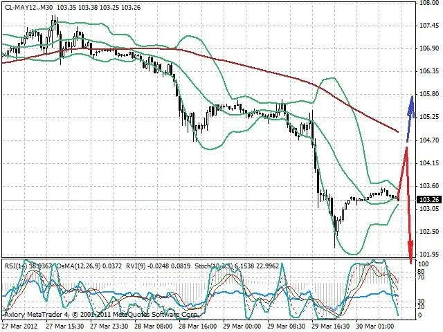 Předpokládaný pohyb pro dnešní den SHORT. Případné vstupy do obchodu z hladiny 104.5 s předpokládaným cílem 101.85 případně až 101. Proražení hladiny 104.5 může vést k pohybu s pravděpodobným cílem 105.7 až 106.2.