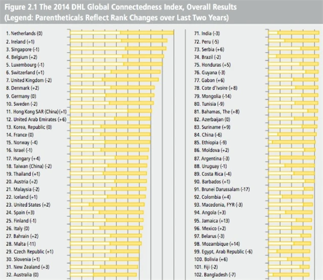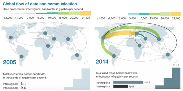 Svět si je stále bližší, a to hospodářské krizi a (ne)přímo související zvedající se vlně ekonomického a politického nacionalismu navzdory. Svědčí o tom mnohé ukazatele, mezi něž patří i Global Connectivity Index, podle kterého po krizové paralýze z roku 2012 globalizace v roce 2014 opět nabrala dech. Nadále však vykazuje výrazné nerovnováhy. Přeshraniční telefonáty například z 41% směřují z rozvinutých do rozvíjejících se ekonomik (migrující pracovní síla), opačným směrem jich míří jen 9 %.