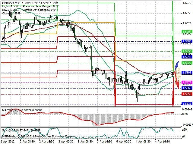 Předpokládaný pohyb pro dnešní den SHORT. Případné vstupy do obchodu z hladiny 1.5905 s předpokládaným cílem 1.5865, případně až 1.583. Proražení hladiny 1.591 může vést k pohybu s pravděpodobným cílem 1.593 až 1.597.