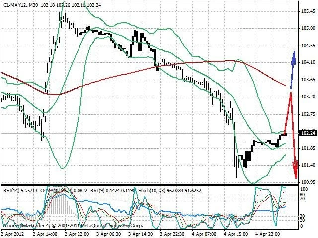 Předpokládaný pohyb pro dnešní den SHORT. Případné vstupy do obchodu z hladiny 103.25 s předpokládaným cílem 101 případně až 99.95. Proražení hladiny 103.25 může vést k pohybu s pravděpodobným cílem 104.25 až 105.15.