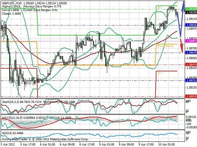 Předpokládaný pohyb pro dnešní den LONG. Případné vstupy do obchodu z hladiny 1.5885 s předpokládaným cílem 1.593, případně až 1.596. Proražení hladiny 1.5885 může vést k pohybu s pravděpodobným cílem 1.5865 až 1.584.
