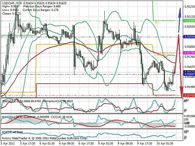 Předpokládaný pohyb pro dnešní den SHORT. Případné vstupy do obchodu z hladiny 0.9195 s předpokládaným cílem 0.9135, případně až 0.911. Proražení hladiny 0.9195 může vést k pohybu s pravděpodobným cílem 0.922 až 0.924.