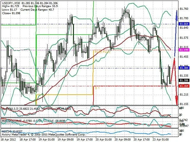 Předpokládaný pohyb pro dnešní den SHORT. Případné vstupy do obchodu z hladiny 81.45 s předpokládaným cílem 81.15, případně až 80.85. Proražení hladiny 81.5 může vést k pohybu s pravděpodobným cílem 81.75 až 81.85.