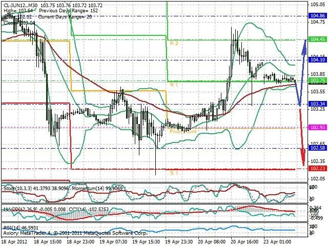 Předpokládaný pohyb pro dnešní den LONG. Případné vstupy do obchodu z hladiny 103.3 s předpokládaným cílem 104.45 případně až 104.9. Proražení hladiny 103.3 může vést k pohybu s pravděpodobným cílem 102.9 až 102.3.