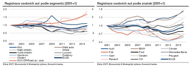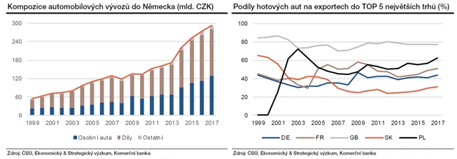 Automobilové exporty také pouze zpomalí z 8,1 % v roce 2017 na 5,8 % v roce 2019. V celém českém vývozu na ně připadá asi 21 %, a budou tak mít zásadní vliv na výkon ekonomiky. Navíc jsou podobně jako celkový export České republiky koncentrovány (z třetiny) na Německo.