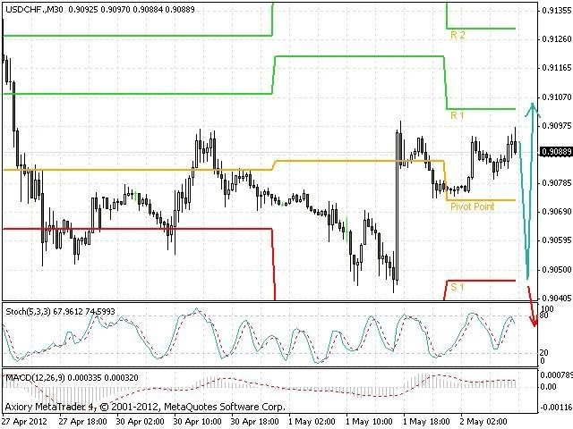 Předpokládaný pohyb pro dnešní den LONG. Případné vstupy do obchodu z hladiny 0.9045 s předpokládaným cílem 0.91, případně až 0.912. Proražení hladiny 0.9045 může vést k pohybu s pravděpodobným cílem 0.903 až 0.901.