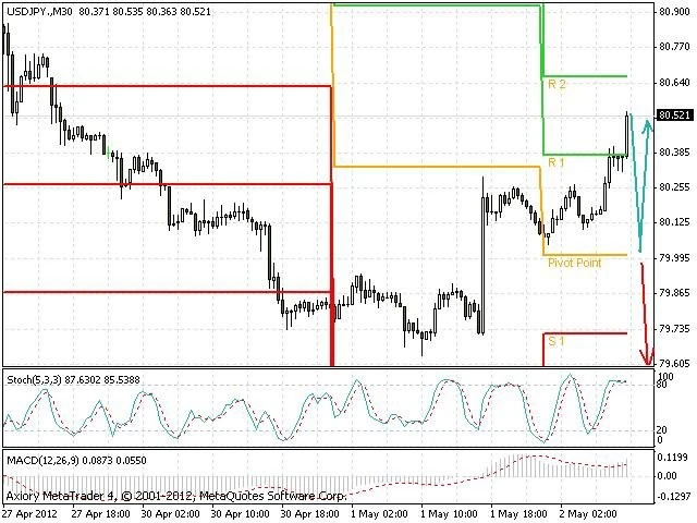 Předpokládaný pohyb pro dnešní den LONG. Případné vstupy do obchodu z hladiny 80 s předpokládaným cílem 80.5, případně až 80.7. Proražení hladiny 79.95 může vést k pohybu s pravděpodobným cílem 79.6 až 79.3.