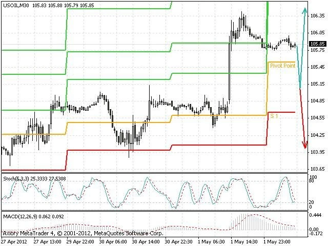 Předpokládaný pohyb pro dnešní den LONG. Případné vstupy do obchodu z hladiny 105 s předpokládaným cílem 106.4 případně až 107.1. Proražení hladiny 105 může vést k pohybu s pravděpodobným cílem 104,05 až 103.55.