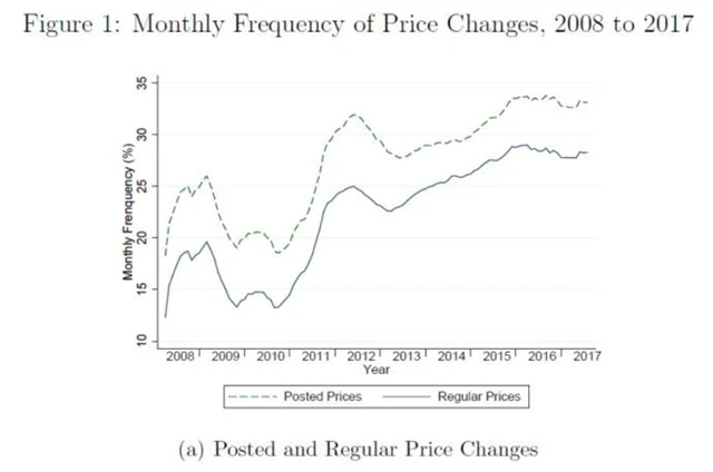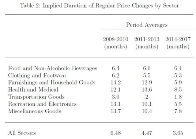 Cavallovy odhady ukazují, že se měsíční frekvence změn cen zdvojnásobila. V letech 2008-2010 se ceny měnily v průměru každých 6,5 měsíce. V letech 2014-2017 klesla perioda na 3,7 měsíce. Největší nárůst frekvence změn cen zaznamenaly nábytek, vybavení domácností, ceny rekreací a elektroniky.