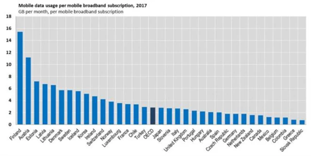 Zajímavá je také statistika toho, jak svou telekomunikační infrastrukturu využíváme. Když třeba srovnáme spotřebu dat na mobilních telefonech, zjistíme, že jsme zhruba na pětině hodnoty uživatelů v Rakousku a třetinu pod průměrem zemí OECD.