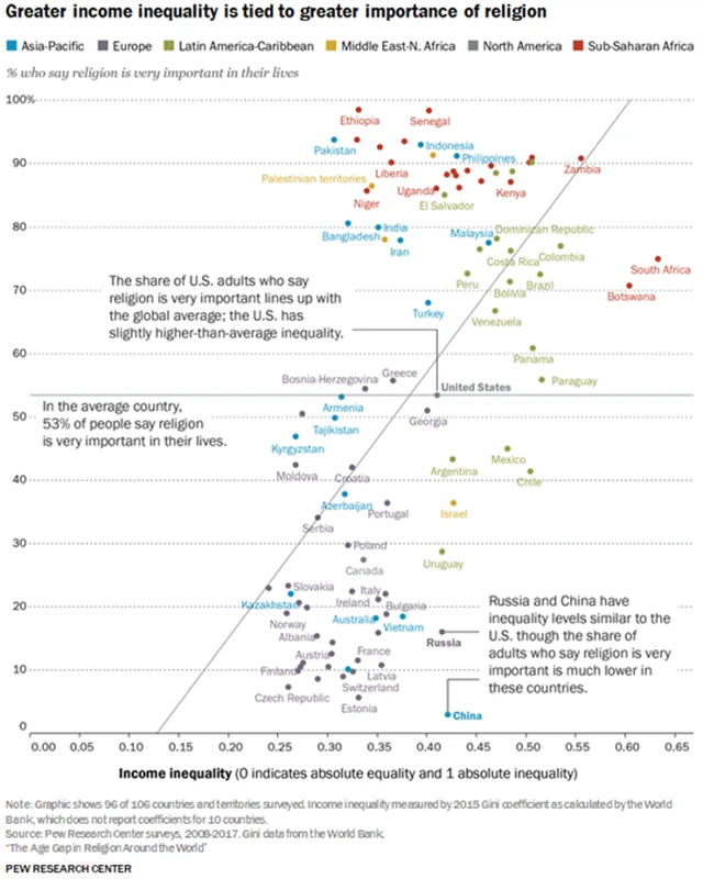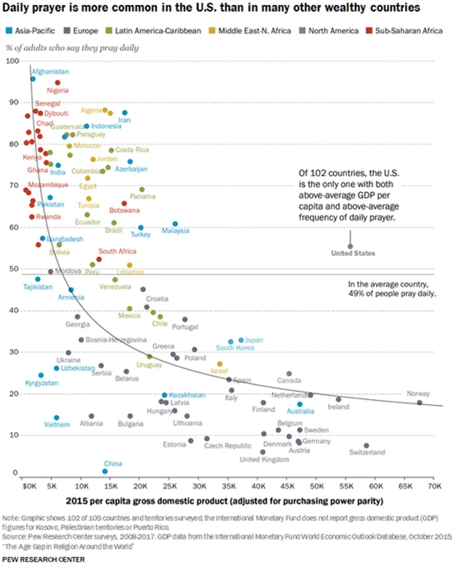 Spojené státy jsou dokonce jedinou ze 102 zemí zahrnutých do průzkumu Pew Research Center, která se může pochlubit zároveň nadprůměrným bohatstvím a nadprůměrným podílem praktikujících věřících.