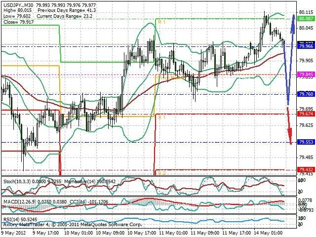 Předpokládaný pohyb pro dnešní den LONG. Případné vstupy do obchodu z hladiny 79.7 s předpokládaným cílem 80.1, případně až 80.25. Proražení hladiny 79.7 může vést k pohybu s pravděpodobným cílem 79.55 až 79.4.