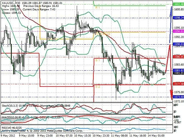 Předpokládaný pohyb pro dnešní den SHORT. Případné vstupy do obchodu z hladiny 1 590 s předpokládaným cílem 1 572.5, případně až 1 564. Proražení hladiny 1 590 může vést k pohybu s pravděpodobným cílem 1 601 až 1 608.