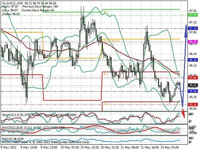Předpokládaný pohyb pro dnešní den LONG. Případné vstupy do obchodu z hladiny 95.1 s předpokládaným cílem 97.15 případně až 97.6. Proražení hladiny 95.1 může vést k pohybu s pravděpodobným cílem 94.7 až 94.35.
