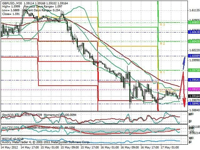 Předpokládaný pohyb pro dnešní den SHORT. Případné vstupy do obchodu z hladiny 1.5975 s předpokládaným cílem 1.589, případně až 1.586. Proražení hladiny 1.5975 může vést k pohybu s pravděpodobným cílem 1.6 až 1.605.