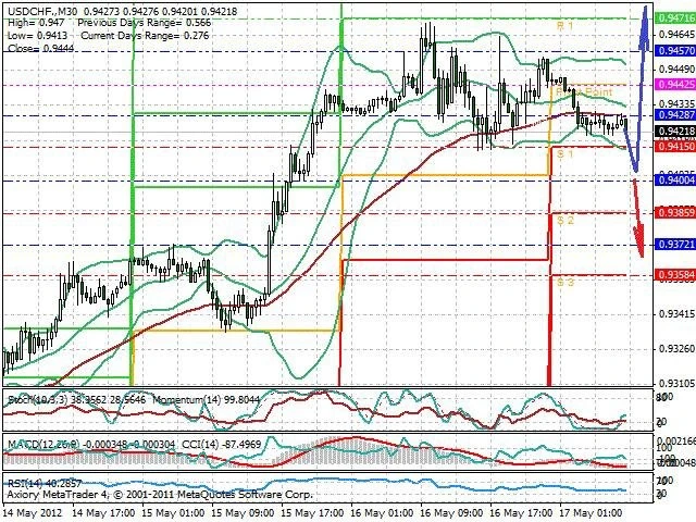 Předpokládaný pohyb pro dnešní den LONG. Případné vstupy do obchodu z hladiny 0.9405 s předpokládaným cílem 0.9475, případně až 0.952. Proražení hladiny 0.9405 může vést k pohybu s pravděpodobným cílem 0.937 až 0.932.