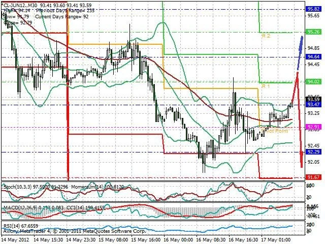 Předpokládaný pohyb pro dnešní den SHORT. Případné vstupy do obchodu z hladiny 94.25 s předpokládaným cílem 91.8 případně až 91. Proražení hladiny 94.25 může vést k pohybu s pravděpodobným cílem 95.15 až 95.7.