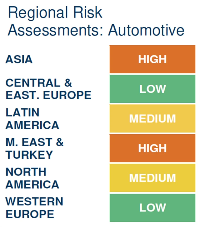 Automobilový průmysl generuje 21 % českého exportu. Ten je závislý na poptávce po nových vozech v řadě států. Třetina exportu automobilového průmyslu míří z Česka do Německa. Jedním z nejvýznamnějších odbytišť (7,3 % exportu) je ale také Spojené království, jehož automobilový trh získal zejména kvůli chystanému brexitu od společnosti Coface hodnocení jako vysoce rizikový.
